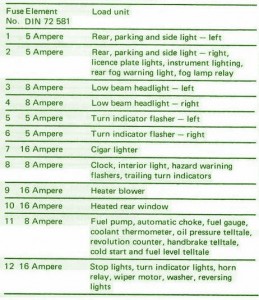 Fuse Panel Layout Diagram Parts: coolant thermometer, oil pressure telltale, stop light, run indicator light, washer, wiper motor, reversing light, parking, side light, license plate light, instrument lighting, fog warning light, fog lamp relay, low beam headlight, indicator flasher, cigar lighter, clock, insterior light, hazard warning flasher, trailing turn indicator, heater blower, fuel pump, automatic choke, fuel gauge.