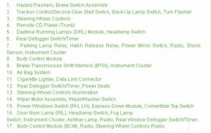 Fuse Panel Layout Diagram Parts: Steering Wheel Controls, Remote CD Player (Trunk), Daytime Running Lamps (DRL) Module, Headlamp Switch, HVAC Selector Switch, Rear Defogger Switch/Timer, Power Windows Switch (RH, LH), Express-Down Module, Instrument Cluster, Air Bag System, Cigarette Lighter, Data Link Connector, Rear Defogger Switch/Timer, Power Seats, Steering Wheel Controls Illumination, Wiper Motor Assembly, Parking Lamp Relay, Hatch Release Relay, Power Mirror Switch, Radio, Shock Sensor, Instrument Cluster, Convertible Top Switch, Door Illum Lamp (R/L), Headlamp Switch, Fog Lamp Switch, Instrument Cluster, Ashtray Lamp, Radio, Rear Window Defogger Switch/Timer, Body Control Module (BCM), Radio, Amplifier, Steering Wheel Controls-Radio, Body Control Module, Brake-Transmission Shift Interlock (BTSI), Hazard Flashers, Brake Switch Assembly, Traction Control/Second-Gear Start Switch, Back-Up Lamp Switch, Turn Flasher, Wiper/Washer Switch.
