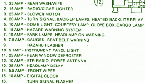 Fuse Panel Layout Diagram Parts: rear window defrost, power antenna, headlamp delay, wiper digital clock, turn signal flasher, cargo lamp, hazard warning system, park lamp, rear washer, radio, cigar lighter, blower motor, turn signal, back up lamp, heated backlite relay, dome light, courtesy lamp, glove box, headlamp, gauges, seat belt warning hazard flasher, instrument panel light,