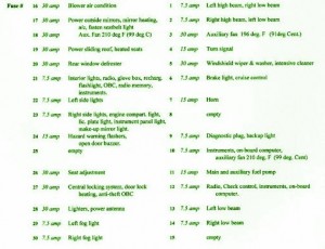 Fuse Panel Layout Diagram Parts: rear window defroster, interior light, radio, make up mirror light, plate light, open door buzzer, seat adjustment, intensive cleaner, on board computer, radio, clock control, auxiliary fuel pump, glove box, recharge, radio memory, instrument cluster, side light, blower air condition, power outside mirror, power antenna, horn, brake light, turn signal.