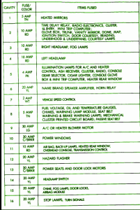 Fuse Panel Layout Diagram Parts: heater rear window, vehicle speed control, hazard mirror, time delay relay, radio electronic, instrument cluster, fog lamp, A/C illumination, heater control, console gear selector, cigar lighter, air bag, back up lamp, transmission control, hazard flasher, fuel voltage, oil and temperature gauges, mini trip computer, glove box, vanity mirror, dome map, ignition switch, door courtesy reading, headlamp, airbag module, warning lamp module, heater blower motor, power window, power seats and door lock motors, headlamp switch,