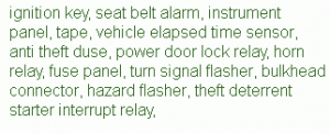 Fuse Panel Layout Diagram Parts: hazard flasher, theft deterrent starter interrupt relay, ignition key, seat belt alarm, power door lock relay, horn relay, fuse panel, instrument panel, tape, vehicle elapsed time sensor, anti theft fuse, turn signal flasher, bulkhead connector,.