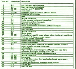 Fuse Panel Layout Diagram Parts: lighters, power antenna, parked car heater, booster, fog light, high beam, low beam, heater blower, back up relay, outside power mirror, mirror heating, air conditioner, power seat memory, power sliding roof, heated seat, rear window defogger, auxiliary fan, turn signal, windshield wiper and washer, intensive cleaner, brake light, cruise control, horn, engine electrical equipment, back up light, instrument cluster, main and auxiliary relay, fuel pump, radio, check control, on board computer, without connection, interior light, radio, glove box, rechargable flashlight, side light, engine compartment light, hazard warning light, open door buzzer, central locking system, door lock heating, burglar alarm system,