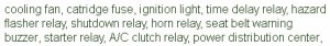 Fuse Panel Layout Diagram Parts: horn relay, seat belt warning buzzer, starter relay, A/C clutch relay, power distribution center, cooling fan, catridge fuse, ignition light, time delay relay, hazard flasher relay, shutdown relay,