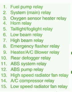 Fuse Panel Layout Diagram Parts: A/C compressor relay, low speed radiator fan relay, emergency flasher relay, heater, blower relay, ABS system, ABS pump, fuel pump relay, main relay, oxygen sensor heater, horn relay, tail light, fog light, low beam relay, high beam relay, rear defogger, high speed radiator.