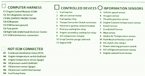 Fuse Panel Layout Diagram Parts: throottle position sensor, engine coolant temperature, switch, A/C clutch, engine coolant level sensor, fuel injector, idle air control motor, fuel pump relay, clutch connector, ignition control module, A/C compressor relay, EVAP canister, digital EGR, vehicle speed sensor, oxygen sensor.