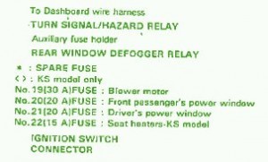 Fuse Panel Layout Diagram Parts: power window, driver power window, seat heaters, rear window defogger, blower motor, hazard relay, dashboard wire harness, auxiliary fuse holder, turn signal.