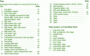 Fuse Panel Layout Diagram Parts: glove compartment light, heater control, illumination,.cigar lighter, power seat, control unit, windshield wiper, A/C clutch relay, vanity mirror, socket, cigar lighter, radio, rear window wiper, central locking system, electric mirror, seat heating, side marker light, high beam, intermitten wiper relay, fuel pump, license plate light, rear window defogger, turn signal, fog light, emergency flasher, horn, stop light, clock, power supply, fog lamp relay, cooling fan, up shift relay, load reduction, horn relay, auto trans relay, indicator light, combination instrument, back up light.