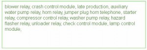 Fuse Panel Layout Diagram Parts: unloader relay, check control module, lamp control module, blower relay, crash control module, late production, auxiliary water pump relay, horn relay, jumper plug horn telephone, starter relay, compressor control relay, washer pump relay, hazard flasher relay.