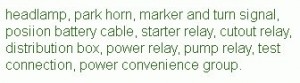 Fuse Panel Layout Diagram Parts: cutout relay, distribution box, power relay, pump relay, test connection, power convenience group, headlamp, park horn, marker and turn signal, position battery cable, starter relay.