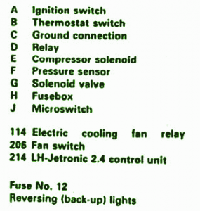 Fuse Panel Layout Diagram Parts: ignition switch, relay, micro switch, fan switch, compressor solenoid, pressure sensor, thermostat switch, ground connection, solenoid valve, fuse box.