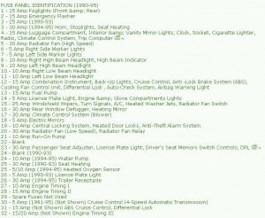 Fuse Panel Layout Diagram Parts: Fuse Panel Layout Diagram Parts: Combination Instrument, Back-Up Lights, Cruise Control, Anti -Lock Brake System (ABS), Cooling Fan Control Unit, Differential Lock (Quattro models), Auto-Check System, Airbag Warning Light, Fuel Pump, License Plate Light, Radiator Fan Relay, Run-On Pump, Passenger Seat Adjuster, License Plate Light, Driver’s Seat Memory Switch Controls, DRL , Water Pump, Seat Heating, Heated Oxygen Sensor, License Plate Light, Trailer Receptacle, Engine Timing, Radiator Fan Switch, Rear Window Defogger, Heating Mirror, Climate Control System (Blower), Electric Mirrors, Central Locking System, Heated Door Locks, Anti-Theft Alarm System, Cruise Control (4-Speed Automatic Transmission), ABS Cruise Control, Differential Lock, Engine & Glove Compartments Lights, Windshield Wipers, Turn Signals, A/C, Heated Washer Jets, Foglights (Front & Rear), Emergency Flasher, Horn, Stoplights, Seat Heating, Luggage Compartment, Interior; Vanity Mirror Lights, Clock, Socket, Cigarette Lighter, Radio, Climate Control System, Trip Computer, Amp Radiator Fan (High Speed), Side Marker Lights, High Beam Headlight, High Beam Indicator, Low Beam Headlight, Radiator Fan (Low Speed).