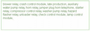 Fuse Panel Layout Diagram Parts: late production, horn relay, jumper plug horn telephone, starter relay, compressor control relay, washer pump relay, hazard flasher relay, unloader relay, check control module, lamp control module, auxiliary water pump relay, blower relay, crash control module.