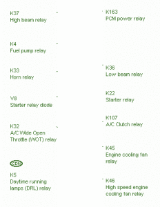 Fuse Panel Layout Diagram Parts: main relay, wiper control unit, unloader relay, normal speed relay, fuses, horn relay, fuel pump relay, high beam relay, low beam relay, fog light relay.