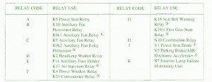 Fuse Panel Layout Diagram Parts: auxiliary fan, seat belt warning, first gear start, air injection, power window relay, convenience relay, headlamp fuse relay, auxiliary fuse holder, power seat diode, power seat relay, power windjhkow relay, power seat diode, parking brake, electronic accelerator, exterior lamp failure monitoring unit, pre resistor relay, auxiliary fan relay.