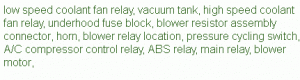 Fuse Panel Layout Diagram Parts: underhood fuse block, blower resistor assembly connector, horn, blower relay location, pressure cycling switch, low speed coolant fan relay, vacuum tank, high speed coolant fan relay, A/C compressor control relay, ABS relay, main relay, blower motor.