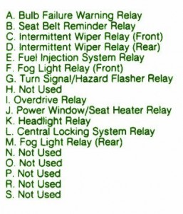 Fuse Panel Layout Diagram Parts: intermitten wiper relay, overdrive relay, power window relay, headlight relay, central locking system relay, fog light relay, bulb failure warning relay, fuel injection system relay, fog light relay, seat belt reminder relay.