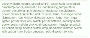 Fuse Panel Layout Diagram Parts: power antenna, security alarm, power seats, cellular phone, air bag system, headlamp switch, air conditioning, heated switch lamp, headlamp dimmer switch with optical horn, body computer, radio display intensity, security alarm module, speed control, power seat, concealed headlamp doors, automatic air load leveling, temperature control, security lamp, high beam headlamp, circuit brajer, power distribution center, ASH receiver lamp, message center illumination, rear window defogger, switch lamp, horn, cigar lighter, power door lock switch.