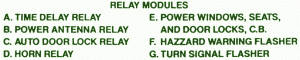 Fuse Panel Layout Diagram Parts: hazzard warning flasher, turn signal.time delay relay, power antenna, auto door lock, horn relay, power window, seat, door lock.