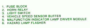 Fuse Panel Layout Diagram Parts: horn relay, light switch, vehicle speed sensor, hazard lamp, fuse block, malfunction indicator lamp.