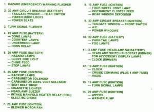 Fuse Panel Layout Diagram Parts: turn signal lamp, wiper, washer pump, tail gate window, rear switch, power door lock, power seats, turn signal, dome lamp, courtesy lamp, underhood lamp, horn relay, hazard lamps, glove box, chime feed, stop lamp, back up lamp, carburetor solenoid, carburetor bowl vent solenoid, seat belt wiper, cigar lighter, headlamp buzzer, intake manifold heater relay, electric choke, blower motor fan, instrument cluster, rear window defogger, front switch, power window, park lamps, tail lamp, fog lamp, clock, headlamp switch, radio, cruise command,