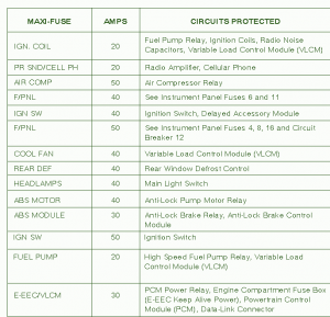 Schemat rozmieszczenia bezpieczników Części: moduł akcesoriów opóźnionych, wyłącznik automatyczny, przekaźnik pompy paliwowej, cewka zapłonowa, kondensatory szumów radiowych, moduł sterowania zmiennym obciążeniem, przekaźnik silnika pompy, przekaźnik hamulca, moduł sterowania hamulcem, wyłącznik zapłonu, moduł sterowania układem napędowym, złącze transmisji danych, wzmacniacz radiowy, telefon komórkowy, przekaźnik sprężarki powietrza, bezpieczniki instrumentu, wyłącznik zapłonu, przekaźnik pompy wysokoobrotowej, moduł sterowania zmiennym obciążeniem, przekaźnik zasilania PCM, moduł sterowania zmiennym obciążeniem, sterowanie odszranianiem tylnej szyby, główny wyłącznik światła, skrzynka bezpieczników komory silnika.
