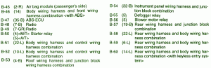 Fuse Panel Layout Diagram Parts: control wiring harness combination, instrument panel, air bag module, body wiring harness, ABS system, radio, defogger relay, blower motor relay, junction combination, keyless entry system, starter relay, body wiring harness,
