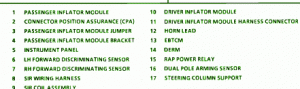 Fuse Panel Layout Diagram Parts: passenger inflator module, connector position assurance, instrument panel, discriminating sensor, dual pole arming sensor, steering column support, driver inflator module, horn lead, power relay, wiring harness.
