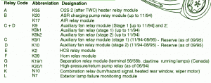 Fuse Panel Layout Diagram Parts: heater relay module, ASR charging pump relay module, A/R relay module, auxiliary relay fan module, HCS realay module, horn relay module, daytime running lamp, return pump relay, combination relay, hazard signal, heated rear window, wiper motor, exterior lamp failure monitoring module.