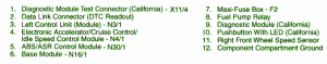 Fuse Panel Layout Diagram Parts: right front wheel speed sensor, cruise control, pushbutton with LED, diagnostic module, idle speed control module, left control unit, base module, maxi fuse box, fuel pump relay, electronic accelerator, diagnostic module, test connector, data link connector, component compartment ground.
