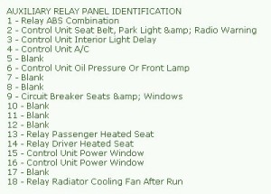 Fuse Panel Layout Diagram Parts: control unit oil pressure, circuit breaker, relay passenger heated seat, ABS combination, control unit seat belt, park light, radio warning, relay driver heated seat, control unit power window, radiator cooling fan, interior light delay,