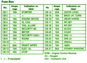 Fuse Panel Layout Diagram Parts: tail illumination, security, meter, front wiper, rear wiper, audio, cigar lighter, ABS system, power window, Hydraulic unit, engine control module, Starter, Engine device, stop lamp, door lock, back up, ignition coil.
