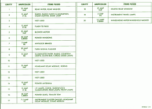 Fuse Panel Layout Diagram Parts: heated rear window, instrument panel lamp, windshield wiper illuminated entry, courtesy light, glove box, instrument cluster, gauges, headlamp delay module, chime module, horns, power antenna clock, radio clock, illumination rear lamps front lamp, power seat, trailer tow, rear washer, radio, radio clock illumination, cigar lighter, dome lamp, flash to pass, blower motor, power window, anti lock brake, turn signal flasher, dome lamps, headlamp delay module, rear wiper.