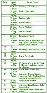 Fuse Panel Layout Diagram Parts: instrument cluster gauges, headlamp delay module, chime module, dome lamp, tell tales, headlamp delay module, horns, powerl door lock, I.P. Lamp, clock, instrument panel lamp, radio illumination, windshield wiper/washer, rear wiper, rear washer, radio, cigar lighter, passing light, overhead console, heated rear window, power window, antilock brake, turn signal flasher, courtesy light, glove box, cargo, blower motor, headlamp switch, park lamp, power seats, trailer tow,