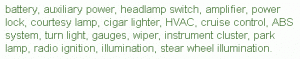 Schemat rozmieszczenia bezpieczników Części: akumulator, zasilanie pomocnicze, przełącznik reflektorów, wzmacniacz, blokada zasilania, lampka grzecznościowa, zapalniczka do cygar, HVAC, tempomat, system ABS, kierunkowskazy, wskaźniki, wycieraczka, zestaw wskaźników, lampa postojowa, zapłon radia, podświetlenie, podświetlenie kierownicy.