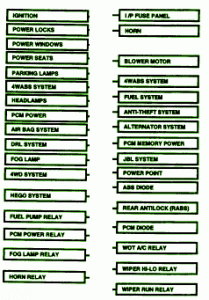 Fuse Panel Layout Diagram Parts: JBL system, power point, ABS diode, rear antilock, PCM diode, A/C relay, wiper relay, Air bag system, DRL system, Fog lamp, 4WD system, hego system, fuel pump relay, ignition, power lock, power window, power seat, parking lamp, 4WABS system, headlamp, PCM power, fuel system, anti theft system, PCM power relay, fog lamp relay, horn relay, I/P fuse panel, horn, blower motor, alternator system.