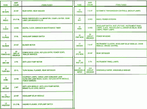 Fuse Panel Layout Diagram Parts: clock, headlamp dimmer switch, blower motor, power door lock, keyless entry, anti lock pump motor, turn signal flasher, courtesy lamp, cargo lamp,, keyless entry module, headlamp delay module, hazard flasher, power antenna, back up lamps, headlamp switch, power window, rear defogger, intermitten panel light, windshield wiper, wiper, washer, radio, cigar lighter, dome lamp, digital
