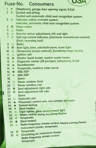 Fuse Panel Layout Diagram Parts: seat adjustment, hydraulic unit, control locking, cigar lighter, glove compartment light, seat heater, instrument cluster, garage door opening signal, control unit, child seat recognition system, indicator, exterior mirror adjustment, washer nozzle heater, sound booster, power window, roof light, horn, circulating air, anti theft alarm, trunk light, ignition coil, washer liquid heater.