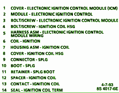 Fuse Panel Layout Diagram Parts: splg boot, ignition coil, housing ASM, cover, spacer, contact, ignition coil term, electronic ignition control module, connector, boot, retainer.