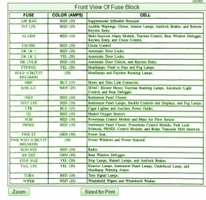 Fuse Panel Layout Diagram Parts: supplemental inflatable restrain, audible warning chime, interior lamp, antilock brake, remote keyless entry, traction control, rear window defogger, cruise control, automatic door lock, headlamp, fog lamp, daytime running lamp, horns, data link connector, HVAC, blower, auto light control, instrument panel cluster, cigar lighter, auxiliary power socket, PCM, control module, power seat, power window, power sunroof, radio, hazard lamp, antilock brakes, exterior lamp, underhood lamp, turn signal lamp, windshield wiper.