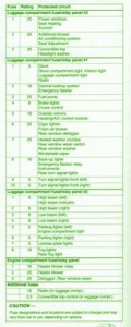 Fuse Panel Layout Diagram Parts: heating A/C control module, cigar lighter, heated washer nozzles, convertible top, headlight washer, glove compartment light, interior light, luggage compartment light, central locking system, rear window wiper, turn signal light, parking light, engine compartment light, license plate light, fog light, power window, seat heating, sunroof, air conditioning, emergency flasher, fuel pump, cruise control,