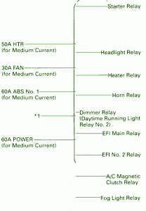 Fuse Panel Layout Diagram Parts: starter relay, daytime running light, horn relay, dimmer relay, A/C magnetic clutch relay, fog light relay, headlight relay, heater relay, fan relay, ABS system.