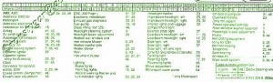 Fuse Panel Layout Diagram Parts: reversing light, side light, low beam headlight, interior light, cigar lighter, clock, connector for optional, cruise control, cruise seats adjustment, high beam headlight, ABS system, motorsport, airbag, air conditioning, heated seat window, heated blower, automatic transmission, anti theft system, electronic immobilizer, exhaust gas diagnosis, fuel pump, headlight cleaning system, brake light, parking light.