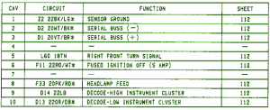 Fuse Panel Layout Diagram Parts: low instrument cluster, right front turn signal, fused ignition, headlamp feed, high instrument cluster, sensor ground, serial buss,