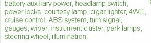 Fuse Panel Layout Diagram Parts: wiper, instrument cluster, park lamps, steering wheel, illumination, courtesy lamp, cigar lighter, 4WD, cruise control, ABS system, turn signal, gauges, battery auxiliary power, headlamp switch, power locks.
