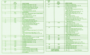 Fuse Panel Layout Diagram Parts: headlight, auxiliary fan, flasher relay, active check control, stop light, map reading light, cruise control, rear defogger, injection electronic, seat belt warning, tachometer, brake warning system, back up light, radio, antenna, speedometer, headlight, sunroof, power window, auxiliary fan relay, cigar lighter, radio, fog light, service interval indicator, fuel economy gauges, trunk light, ignition key warning, glove box light, auto charging flash light.