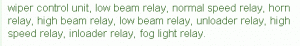 Fuse Panel Layout Diagram Parts: wiper control unit, low beam relay, normal speed relay, horn relay, high beam relay, low beam relay, unloader relay, high speed relay, inloader relay, fog light relay.