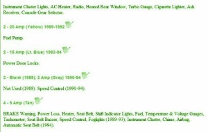 Fuse Panel Layout Diagram Parts: instrument cluster, AC heater, radio, heated rear window, power loss, heater.seat belt, shift indicator light, seat belt brzęczyk, console gear selector, fuel pump, power door lock, speed control, fog light, airbag, automatic seat belt, turbo gauge, cigar lighter, ash receiver,
