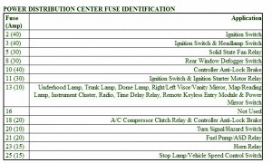 Fuse Panel Layout Diagram Parts: underhood lamp, controller antilock brake, hazard switch, fuel pump, horn relay, stop lamp, vehicle speed control switch, instrument cluster, remote keyless entry module, mirror switch, A/C compressor clutch relay, radio, time delay relay, rear window defogger switch, ignition switch, headlamp switch, solid state fan relay, turn signal, trunk lamp, dome lamp, right left visor, vanity mirror, map reading lamp, controller anti lock brake, ignition switch.