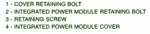 Fuse Panel Layout Diagram Parts: retaining screw, integrated power module cover, cover retaining bolt, integrated power module retaining bolt.